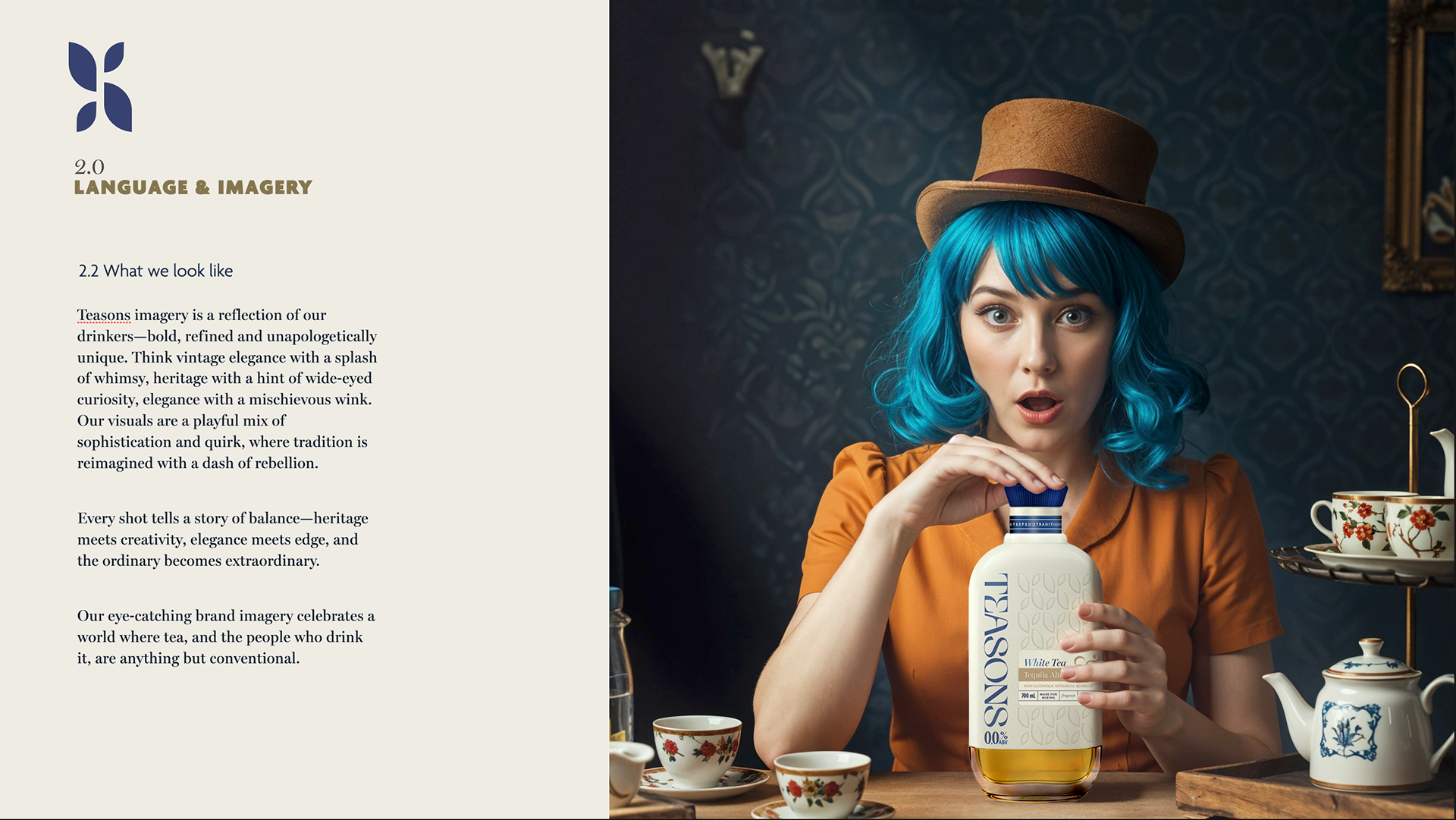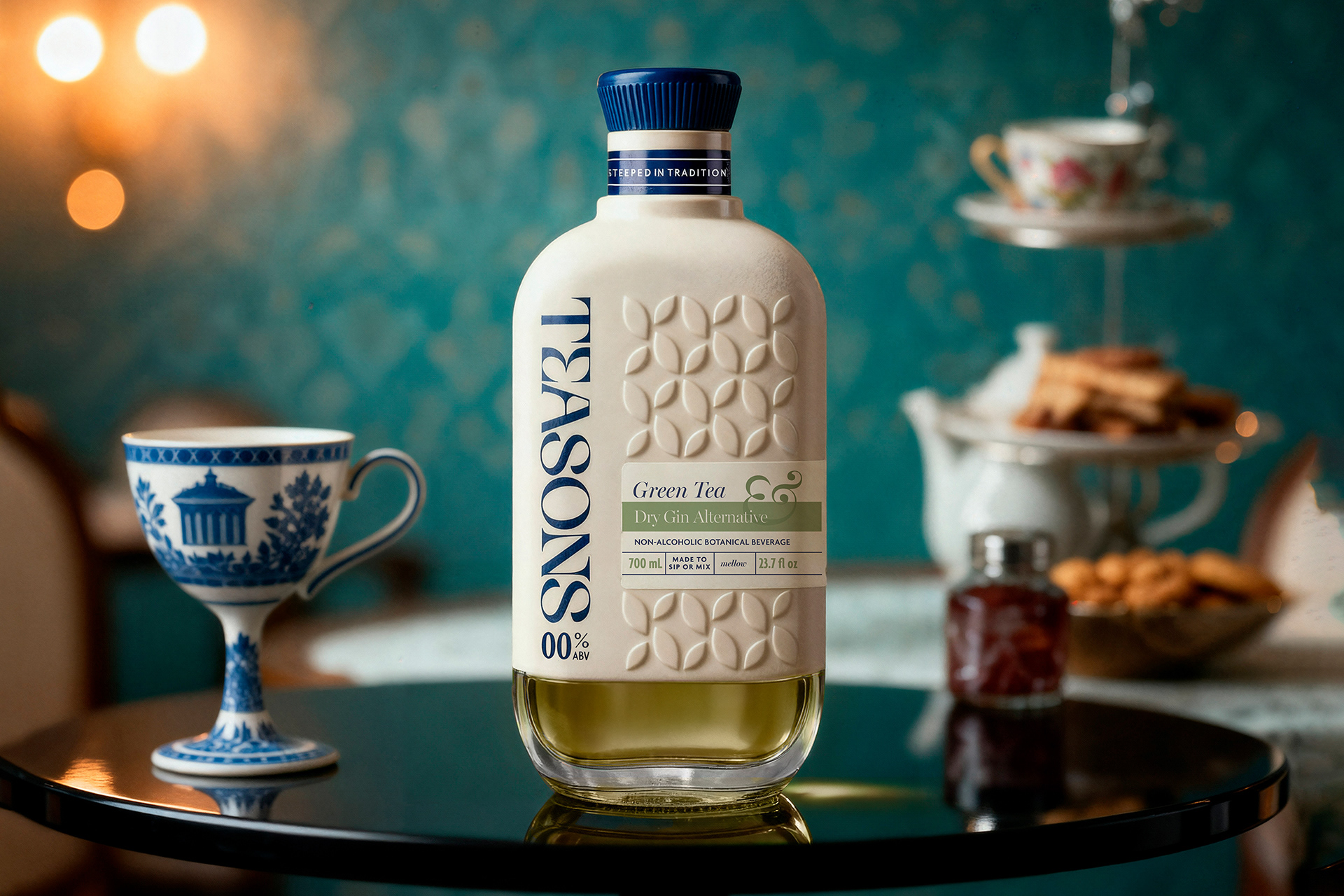 PROJECT: Brand creation and bespoke bottle design for a range of tea-based zero-proof spirit | DESIGN CONCEPT: Drawing inspiration from tea-producing regions, native botanicals, and the visual language of Delftware and Chinese ceramics | RANGE: Four flavour variants | BRAND EXTENSION: Brand bible and imagery | CLIENT BASED: UK